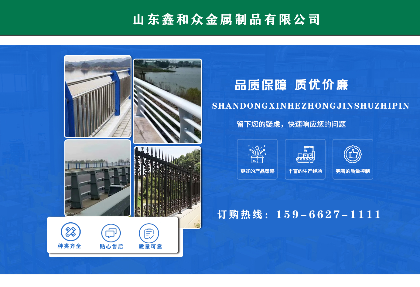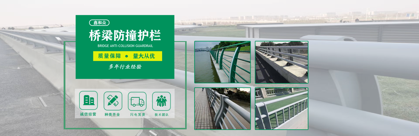 山東鑫和眾金屬制品有限公司主要產(chǎn)品有防撞護欄,橋梁護欄,道路護欄,河道護欄,不銹鋼護欄等護欄。提供設計方案,一站式定制,包您滿意價格優(yōu)惠,歡迎來電咨詢!    公司常年從事銷售護欄防撞護欄,橋梁護欄,道路護欄,河道護欄,不銹鋼護欄,橋梁鋼護欄,河道燈光護欄等。產(chǎn)品廣泛應用于橋梁、河道、旅游景區(qū)、道路、公路、公園、小區(qū)、景觀、道路防撞等領域。    公司產(chǎn)品均采用優(yōu)質(zhì)不銹鋼材料,符合相關標準。各種型號不銹鋼復合管及護欄,質(zhì)量嚴格把控。產(chǎn)品強度高、耐腐蝕、焊接牢固、抗沖擊、性能好,防撞護欄結構簡單、美觀實用大方。     歡迎前來訂購!...